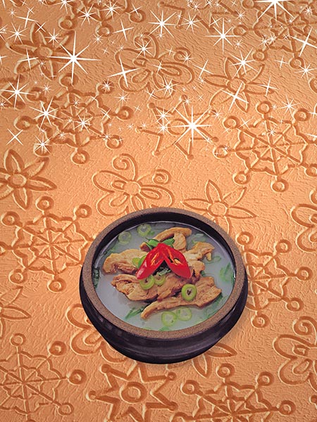 ![]() 鸭肉骨汤 | ![]() 粗茎鳞毛蕨 | ![]() 菠菜泡菜 | ![]() 清蒸鸭 | ![]() 鱿鱼炒饭 |